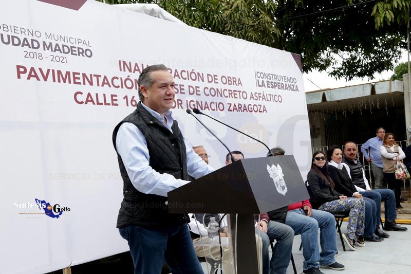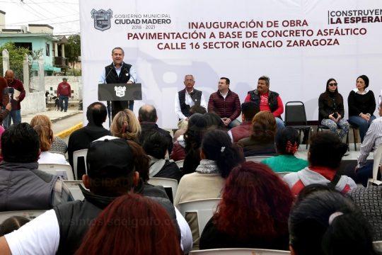 CIUDAD MADERO, TAM.- Combatiendo el rezago en pavimentación de vialidades, Ciudad Madero se convertirá en un lugar seguro, moderno y digno para todos los maderenses, aseguró el alcalde Adrián Oseguera Kernion durante la inauguración de pavimentación de la Calle 16 con la que se benefició a más de 160 habitantes del sector Ignacio Zaragoza.