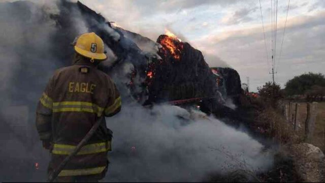 Bomberos voluntarios luchaban para sofocar las llamas; sin embargo las labores continúan de manera indefinida derivado del tipo de materia prima (pastura) que se transportaba.