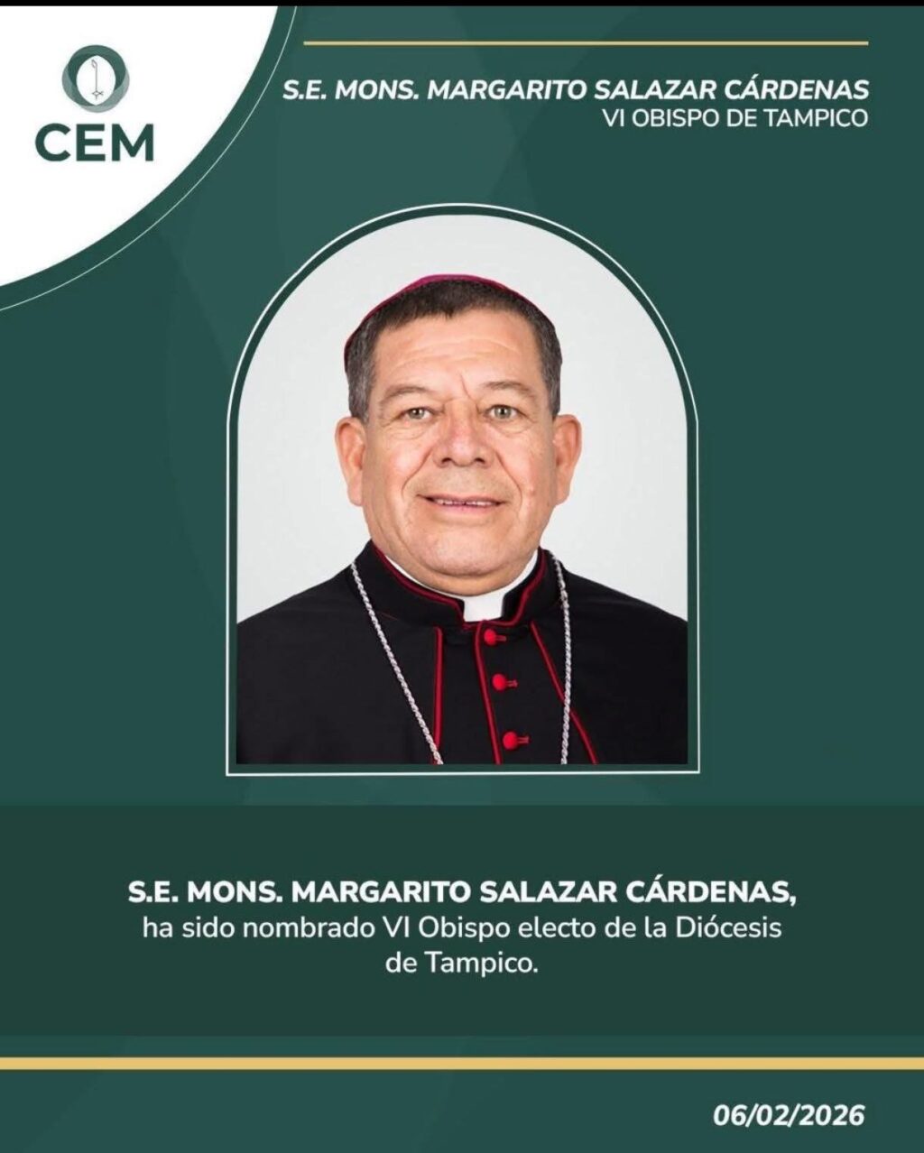 TAMPICO, TAM.- Esta mañana fue designado como muevo titular de la Diócesis de #Tampico Monseñor Margarito Salazar Cárdenas, quien se convierte en el sexto en llevar la encomienda.