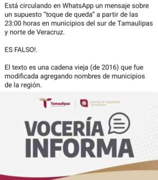 TAMPICO , TAM.- Autoridades de justicia de Tamaulipas desmintieron la veracidad de un mensaje que circula a través de WhatsApp sobre un supuesto “toque de queda” a partir de las 23:00 horas de este martes 24 de febrero en municipios del sur del estado y el norte de Veracruz.