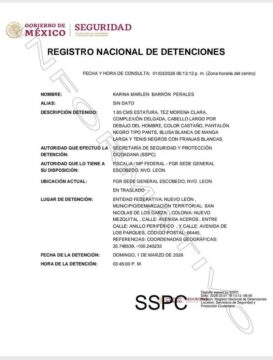 SAN NICOL脕S DE LOS GARZA, N.L.- La Fiscal铆a General de la Rep煤blica detuvo a la Tamaulipeca Karina Barr贸n, secretaria de Desarrollo Humano del municipio de Monterrey, por su presunta responsabilidad en delitos de cohecho y falsificaci贸n de declaraciones dentro de una investigaci贸n judicial en curso.