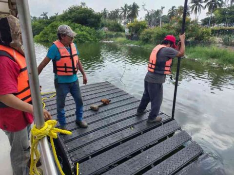 TAMPICO, TAM.- El Gobierno Municipal de Tampico, que preside la alcaldesa Mónica Villarreal Anaya, a través de la Secretaría de Obras Públicas, lleva a cabo la fabricación e instalación de asoleaderos para cocodrilos en la Laguna del Carpintero, con el propósito de mejorar las condiciones del hábitat natural de esta especie y fomentar la convivencia armónica entre la comunidad y la fauna silvestre.