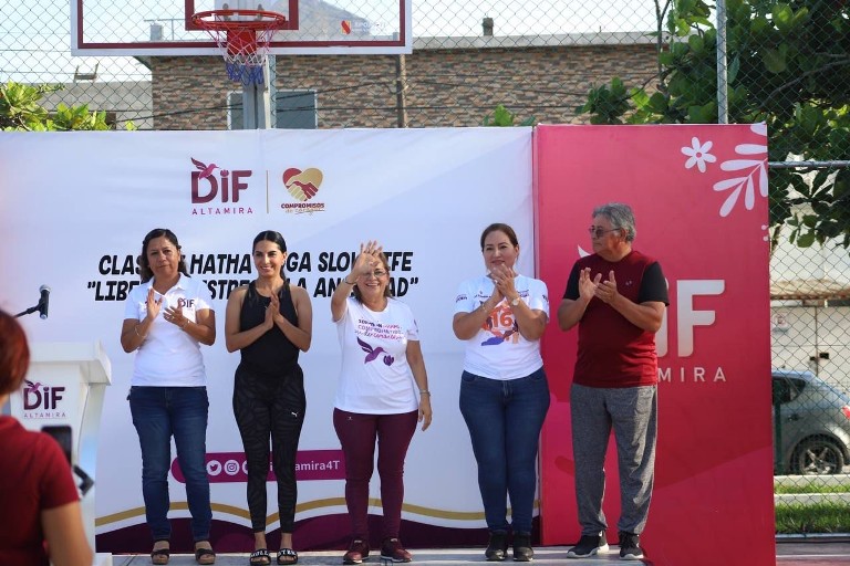 ALTAMIRA, TAM.- Preocupada y ocupada por fomentar entre las familias altamirenses un estilo de vida saludable, en donde se priorice la activación física, la salud y la estabilidad emocional, la presidenta del Sistema DIF local, C.P. Rossy Luque de Martínez participó en la clase gratuita de “Hatha Yoga”, un estilo de yoga centrado en la práctica de posturas físicas y técnicas de respiración que promueven el equilibrio entre cuerpo y mente.