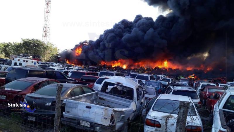 Al menos un centenar de autos fueron calcinados, producto del voraz incendio que se registró la tarde de este lunes en el mesón publico federal en el que se consumieron poco mas de cien vehículos, sin que se conociera la causa que los origino.