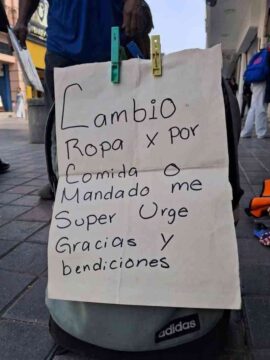 Hizo un letrero, lo recarga sobre una mochila y se instala en un crucero del centro de Tampico, en las calles de Carranza y Juarez. Ahí ve pasar a mucha gente. Algunos la ayudan, otros pasan, leen su aviso y siguen su camino.