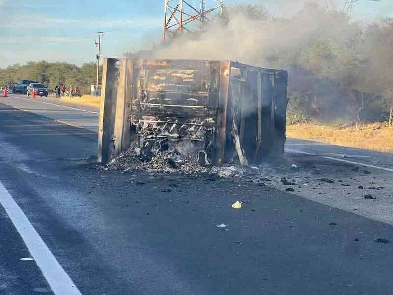 El siniestro ocurrió en el kilómetro 24 de la vía federal, donde la unidad de carga, propiedad de la empresa Vicmart y cargada con mariscos, había salido de Monterrey cuando se produjo el impacto que desencadenó la volcadura y el incendio total del vehículo.